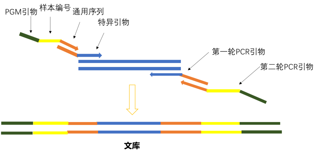 扩增子建库是指利用PCR反应在待测DNA片段两端加上接头的方法,原理相对比较简单,只需要两轮PCR和两步纯化就可以得到目标区域的文库,其中第一步是含通用序列的引物与目标区域结合,第二步通过PCR反应连接测序接头,使得构建的文库可以用于上机测序。