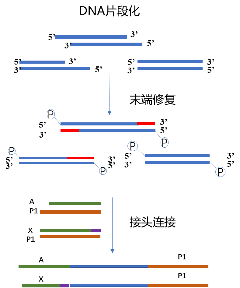 平末端连接接头的方法基于Ion Torrent平台。与Illumina平台类似,Ion Torrent平台的文库构建目的也是在片段化好的DNA片段两端加上特定接头,该方法一般包括4个步骤:DNA样本片段化、末端修复,连接adapter(PI和A/P1和X),选择性回收DNA片段,文库PCR富集,纯化PCR产物。